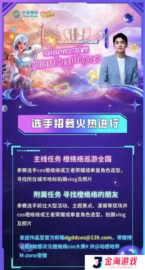 同期举办的2024动感次元橙络络cosplay大赛现已火热报名中,全程3个月,覆盖全国10余省。线上海选期间参赛选手可cos橙络络或王者荣耀角色或拳皇形象,前往所在城市寻找城市地标拍摄vlog及照片,发送作品至官方邮箱,带微博话题#动感地带橙络络cos大赛#并@动感地带M-zone官微,即视为参赛成功。线上海选赛成功晋级者将进入动感地带5G校园先锋赛分省线下赛,最终晋级全国总决赛,成为橙络络官方coser,赢取万元大奖!