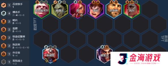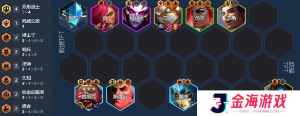 标准阵容:4双形1公敌2搏击2哨兵2法师2铁血2极客1外交