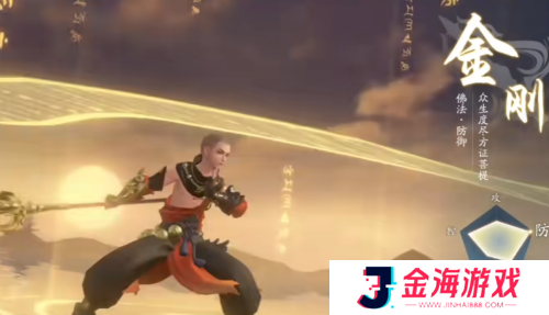 “金刚伏魔”技能使金刚能跳跃至目标区域并对敌人造成按比例的伤害,随着技能等级的提高,伤害比例也会增加,而且跳跃过程中金刚处于无敌状态。而“金钟罩”技能一旦施展,就能启动减伤效果,并且当金刚的生命值降低时,减伤比例会相应提高。此外,金刚还拥有“佛怒值”,此值越高,反弹给敌人的伤害也越强。