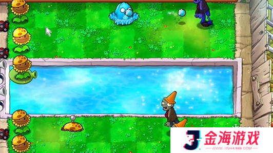 7、最后将泳池左侧的阳光向日葵铲除,补充四个海草豌豆。