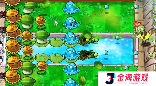 3、在泳池中补充多个豌豆荷叶,在外侧补充两个寒冰坚果。