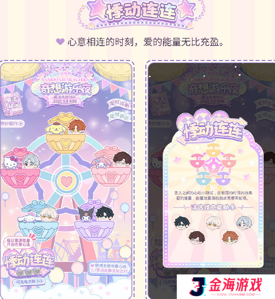 1、参与[悸动连连]玩法,和他一起收集爱的能量,为能量池充电。活动期间每日拥有3次充电次数,每日凌晨5点将自动补充3次充电次数,该次数上限为12次。