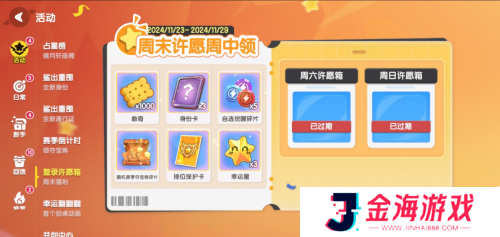11月23日至11月29日周末许愿活动上线游戏,在周末许下心愿,鲨鲨帮你实现!曲奇、身份卡、幸运星哪款是你的最爱?