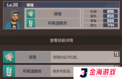 12、德瑞:作为一位才华横溢的服务员,其烹饪与服务能力出众,策划与吸引力也相当不错。能自动整理混乱场地,并为客人提供鸡尾酒服务。