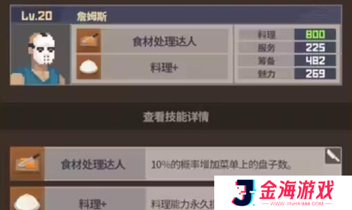 6、詹姆斯(面具):在烹饪方面有较强实力,同时服务与策划能力亦不容小觑。能增加菜单品种,并长期提升烹饪技能。