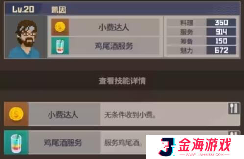 13、凯因:服务能力卓越,烹饪与吸引力同样优秀,虽然策划能力略显不足,但擅长赚取小费。此外,还能自动为客人倒鸡尾酒。