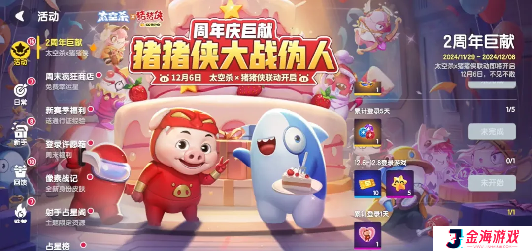 《太空杀》周年庆典于12月6日正式揭幕,《太空杀》×《猪猪侠》二周年联动巨献开启!全新猪猪侠联动主题地图开启,携手GGBOND参与伪人史诗对决,更有多重联动限定奖励等你来拿!同时游戏中开启新身份、新皮肤、十连抽免费大放送活动,登录解锁丰厚礼物!欢迎船员们前来体验二周年庆典!