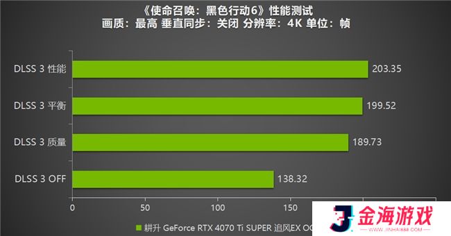 最后进行的是4K分辨率的测试。从图中数据可以看到,即便未启用NVIDIA DLSS 3技术,耕升 GeForce RTX 4070 Ti SUPER 追风EX OC显卡也可跑出平均138.32帧的成绩,玩家能流畅运行游戏。启用NVIDIA DLSS 3技术后,在DLSS 3性能模式下平均帧数能达到203.45帧,为追求极致的4K分辨率玩家带来画质与性能的双重保障。总的来说,《使命召唤:黑色行动6》对配置要求并不算高,在NVIDIA DLSS 3技术的加持下,耕升 GeForce RTX 4070 Ti SUPER 追风EX OC显卡在三种分辨率下都拥有优秀的性能表现,让玩家享受到高帧率的游戏体验。