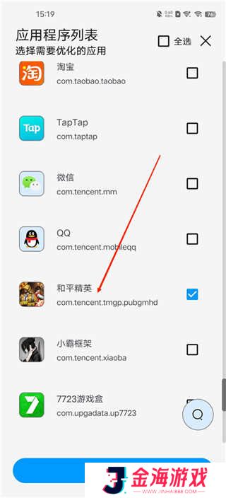 2、然后再到应用列表里的和平精英,勾选上