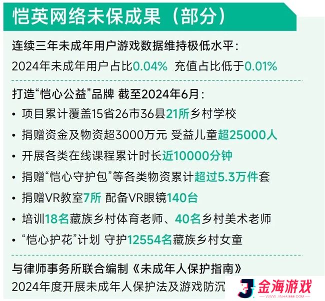 自2021年起,恺英网络旗下自营游戏全面禁止未成年人注册,并采取了一系列措施加强管控,包括游戏时长和充值限制以及定期内容审查等。2024年,恺英网络进一步完善了后台监控和人工巡查机制,防止未成年人冒用成年人账号进行游戏和充值,确保未成年人游戏数据维持在极低水平。