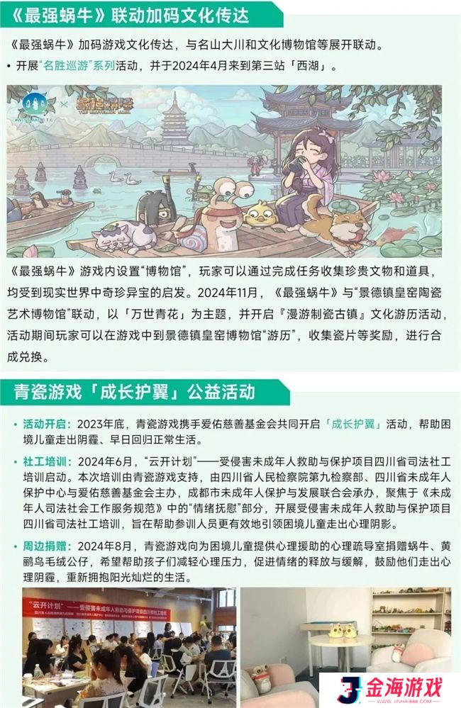 青瓷游戏严格按照规定,对未成年人的游戏时长、充值行为等进行限制,旗下所有游戏产品通过SDK保持统一的未成年防沉迷逻辑,并积极采取相关针对性措施反制影响游戏未成年人保护的黑灰产业。同时,青瓷游戏致力于发挥游戏作为文化产品的作用,吸收历史文化中的艺术精华,通过系列内容包装和大量联动,让未成年在游戏过程中潜移默化地获得相关知识,实现寓教于乐。公益方面,青瓷游戏以《最强蜗牛》联动为基础,推进蜗牛民生、蜗牛农田、蜗牛学村等主要板块,同时参与基金会项目对留守儿童、有特殊困难的儿童以及欠发达地区的女童等展开救助活动。