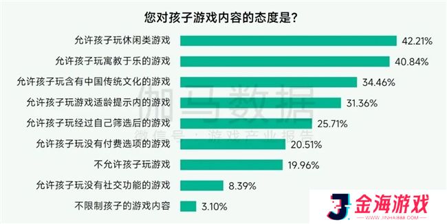 家长问卷结果显示,不限制孩子游戏内容的家长仅占3.1%,说明绝大多数家长普遍认识到游戏对孩子成长的影响,并倾向于对孩子的游戏选择进行一定的引导和管理。基于此,应当加强家校合作与行业共建,筛选推荐有益于未成年人成长的游戏,发挥游戏的正向功能与价值,同时也可以游戏为载体提升未成年人教育效果。