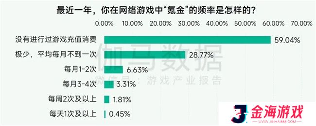 在消费频次方面,59.04%的未成年游戏用户最近一年没有在网络游戏中进行过充值消费,另有28.77%“氪金”频率极低,平均每月不到一次。