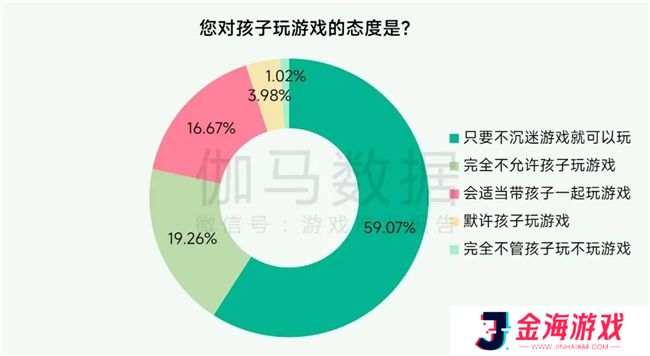 在对待未成年子女玩游戏的态度上,仅小部分家长(19.26%)完全不允许孩子玩游戏,大多数家长(59.07%)认为只要孩子不沉迷就可以玩游戏,有16.67%表示“会适当带孩子一起玩游戏”,仅约1%完全不管孩子是否玩游戏,说明绝大多数家长还是倾向于通过合理引导和参与来管理孩子的游戏时间。