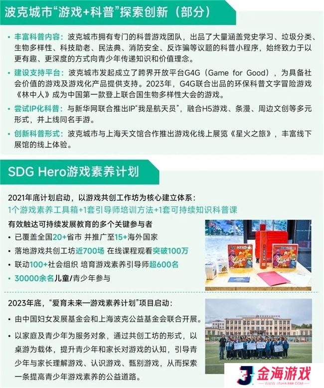 波克城市秉持“游戏+”战略,在游戏和公益等领域持续发力,探索未成年人网络保护的新思路与新范式,在多个方面取得显著成效。一是严格守护未成年人网络安全。波克城市高度重视对未成年人玩家的保护和引导,积极参与制定行业合规标准,并严格执行防沉迷、适龄提示及隐私保护等相关规定。二是创新科普游戏推广模式。波克城市利用游戏载体,挖掘游戏多元价值,持续向青少年推广优秀科普游戏,还尝试实现更规模化、IP化的科普模式,并依托合作资源打造适合青少年的线下科普教育阵地。三是实施“SDG Hero游戏素养计划”。波克城市携手波克公益发起该计划以来,通过游戏思维赋能数百万儿童、青少年、社工及家庭,推动各相关方学习、创新和行动,切实为未成年人成长贡献力量。