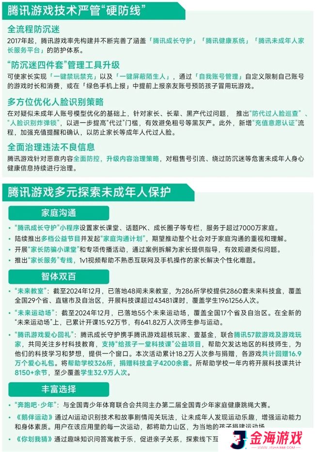 2017年起,腾讯游戏率行业之先构建了涵盖未成年人游戏“事前-事中-事后”全流程的健康防护体系,运用技术能力筑牢未成年人保护“硬防线”,率先主动采取了更严格的“人脸识别”等身份认证办法,并持续推出新举措以加强防沉迷效果。2024年,腾讯游戏全新升级“防沉迷四件套”管理工具,首推“暑期人脸巡航”、“防代过人脸巡查”、人脸识别“炸弹锁”等防护措施,针对性解决账号冒用和租借等问题。消费限制方面,腾讯游戏主动加码禁止12周岁以下未成年人充值,成为行业唯一一家严于主管部门关于“8岁以下禁充”要求的头部厂商。此外,腾讯游戏持续加大对游戏及社区内账号租售等黑灰产相关信息的治理力度,对发布账号予以禁言、短期封禁或永久封停等处罚,并设立“黑产实名举报”入口进行精准打击。另一方面,腾讯游戏不断探索守护未成年人成长的更多可能性。腾讯成长守护推出了面向家长的专题课程、交流社区以及多元公益节目,并发起了“家庭沟通计划”等,致力于加强家庭在未成年人保护中的重要作用。同时,通过开展“智体双百”计划,以及游戏化学习+游戏化运动的守护探索,腾讯游戏不断落地更具建设性的解决方案,为未成年人健康成长创造良好环境。