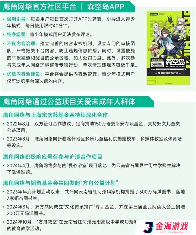 鹰角网络持续深化和完善未成年人防沉迷机制和家长监护工程,旗下游戏产品《明日方舟》和《来自星尘》等均已落实“事前预防—事中监控—事后处理”的全流程管控体系,并不断依托技术升级强化安全保障,有效降低系统被暴力技术破解或绕过的可能性,官方社区森空岛APP自2023年9月上线起便配备平台青少年模式,具备强制引导、纯净观看、内容治理等核心功能,为未成年人营造安全健康的网络环境。同时,针对危害未成年人保护的非法及灰色产业,鹰角网络积极响应网信办等部门定期展开的专项行动,助力对网上涉未成年人突出问题的集中整治,还通过技术手段识别并下架相关非法链接,定期排查、清理、封禁违规账号,并加强政企合作,向网安等管理部门提供灰产相关线索。在社会公益领域,鹰角网络始终关注未成年人健康成长问题,自2022年起与上海宋庆龄基金会携手,多次开展定向捐助、合作共建等活动。2023年底,鹰角网络发起“方舟公益计划”,并于2024年持续推进了一系列公益项目落地,以实际行动履行社会责任,关爱未成年人群体。