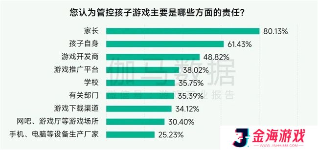 对于未成年人游戏管控责任主体问题,80.13%的家长认为是家长,61.43%的家长认为是孩子自身,游戏开发商、游戏推广平台、游戏下载渠道等游戏产业相关参与者占比也较高。此外,家长认为有关部门、学校、网吧和游戏厅等游戏场所以及手机和电脑等设备生产厂家也有管控责任。未成年人保护是一项综合性工程,需要多方合力,全面优化相关环节落实部署,并加强家庭、学校、**、企业和社会协作,以进一步提升游戏防沉迷工作效果,进而帮助家长更好地引导与管理孩子的游戏行为。