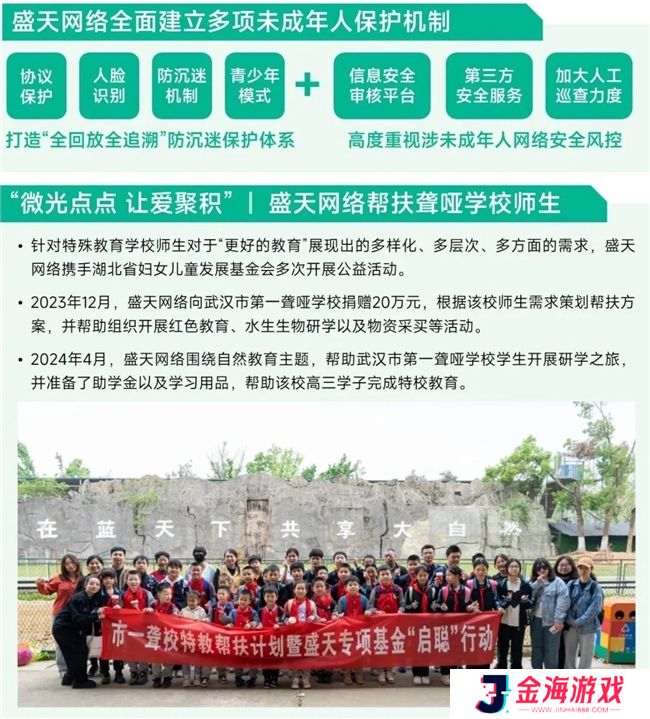 此外,为更好地了解和帮助青少年群体,盛天网络从2019年起就联合武汉大学社保研究中心中国儿童发展与保障研究所共同展开城乡(留守儿童)课题研究,还通过公益项目品牌“微光点点、让爱聚积”开展公益活动并设立专项公益基金,子公司天戏互娱也连续多年参与公益捐助,不断深化对青少年群体的关怀与支持,为未成年人保护事业贡献力量。