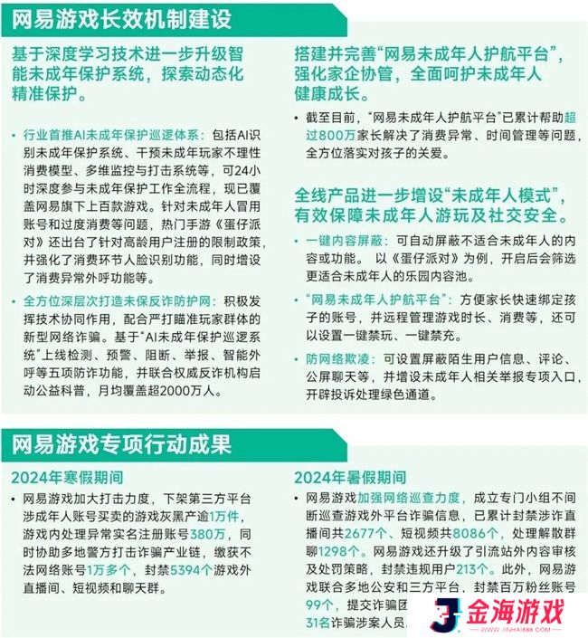 在长效机制建设方面,网易游戏依托多年研运经验和技术积累,首推AI未成年保护巡逻技术,并通过加大人脸验证力度、提升风险干预措施、完善家企协管平台等手段,进一步筑牢游戏内外防护网络。2024年,网易游戏全线产品率先增设“未成年人模式”,未保防护进入新阶段。此外,网易游戏连续数年在寒暑假期间开展专项行动,不仅有效提升了未成年人假期防沉迷及社交安全保障水平,同时在打击游戏黑灰产和域内外诈骗等领域也均取得了显著成果。