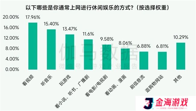 从未成年网民线上休闲娱乐方式选择权重来看,看视频、听音乐、玩游戏位列前三。