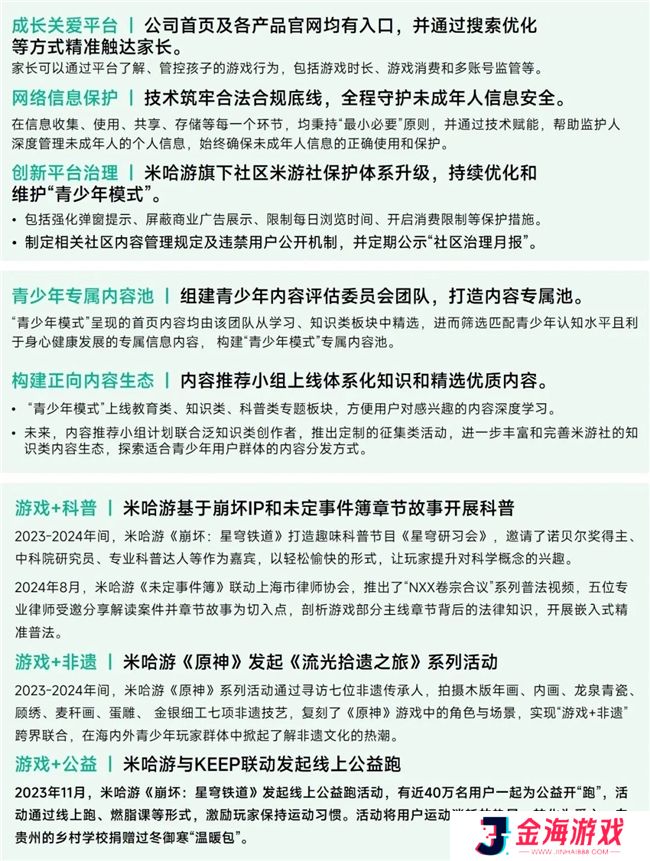 米哈游持续贯彻未成年人网络保护事业宗旨,在游戏内外全方位实施未成年人保护举措,主要通过防沉迷体系建设、未成年人信息安全保护和平台治理创新等,打造安全、健康、向上的网络环境。同时,米哈游始终致力于发挥游戏的正向连接作用,探索非遗的现代化表达和游戏世界观下的趣味科普等路径,以“游戏+”模式促进游戏多元价值在社会现实中的实现。另一方面,米哈游借助游戏的影响力,鼓励青少年玩家积极参与社会公益,并通过组织活动、合作项目、捐献善款等方式,为有需要的未成年人群体提供实质性帮助。