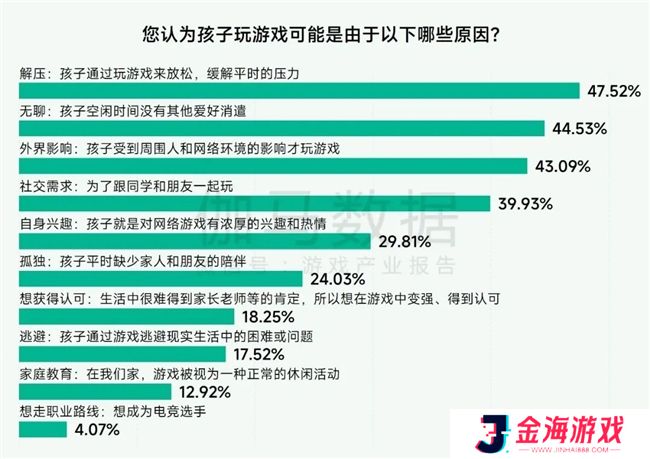 问卷结果显示,家长们允许孩子玩游戏的原因也是多方面的,其中“解压”和“无聊”占比居首,说明多数家长认可游戏是孩子放松和消遣的一种方式,约四成家长将孩子游戏原因归于“外界影响”和“社交需求”,也有一些家长关注到孩子在情感等层面的深层原因。