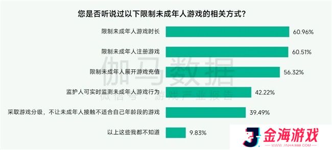 家长问卷结果显示,超九成家长至少听说过一种限制未成年人游戏的相关方式。限制注册、限制时长和限制充值是家长们较为熟悉的游戏管控手段,普及程度均高于55%。但值得注意的是,从单项措施来看,仍有四成左右没听说过限制未成人游戏注册及游戏时长,说明仍需加强体系化宣传教育,以帮助家长正确干预孩子的游戏行为。