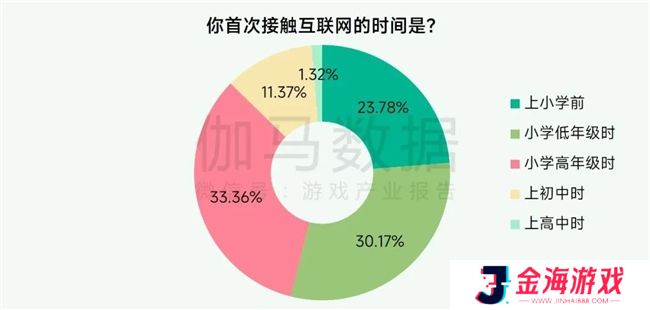 在伽马数据面向未成年人群体的问卷调研中,初中以前首次接触互联网的受访学生比例接近90%,其中学龄前儿童触网比例约占四分之一,未成年人触网低龄化显著。